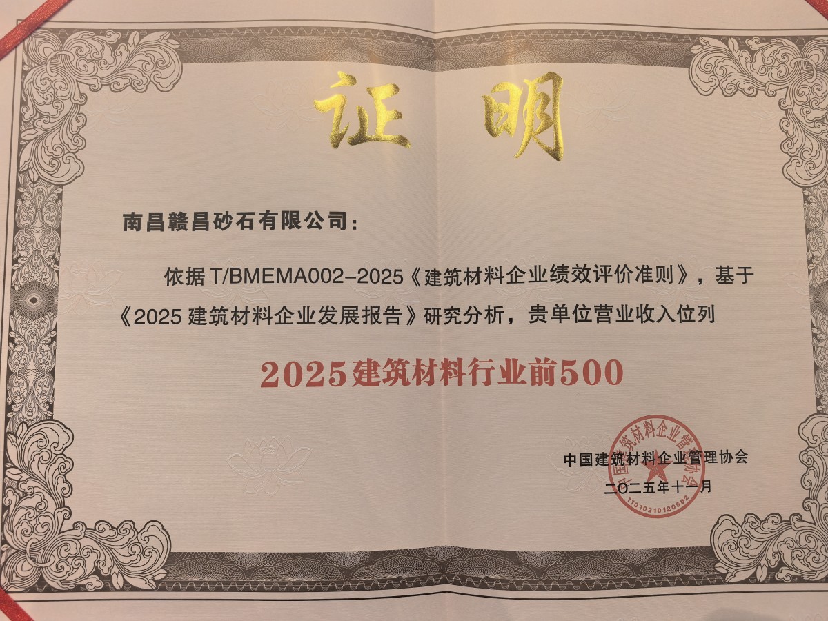 11月26日至28日,由中國建筑材料企業(yè)管理協(xié)會主辦的2025建材企業(yè)發(fā)展大會在太原市召開。贛昌砂石公司榮獲“2025建筑材料行業(yè)前500”“2025成長性五星企業(yè)”兩項(xiàng)榮譽(yù)稱號。